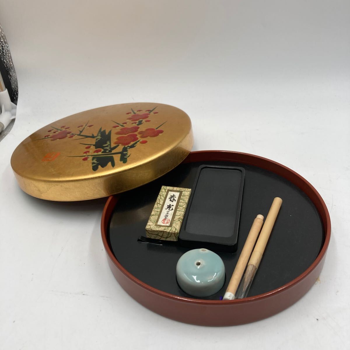 - 工芸品 硯石 雲鈴 丸ミニ 春光園 漆器 ミニ習字セット 小筆