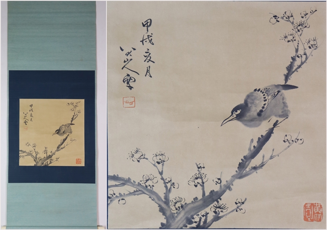 > 古美術 掛け軸 中国・清時代 「八大山人書」 紙本 【花鳥図】 立軸 書道 巻き物 肉筆保証 唐物 古画 画心34.5X33cm LT-241105