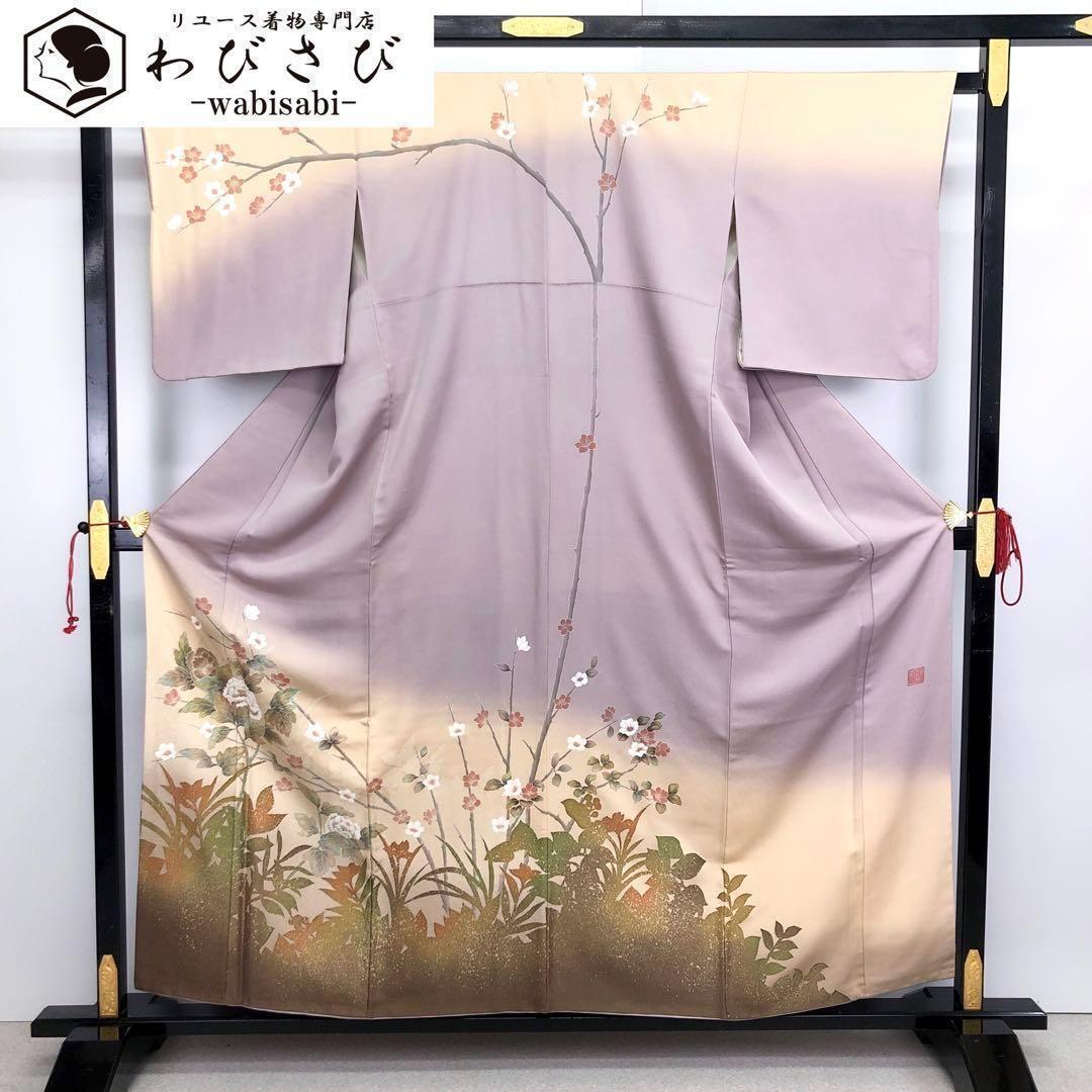 淡藤色の品のあるお色味に暈し、金銀通しに友禅の牡丹や梅の花模様がデザインされた素敵なお品でございます。