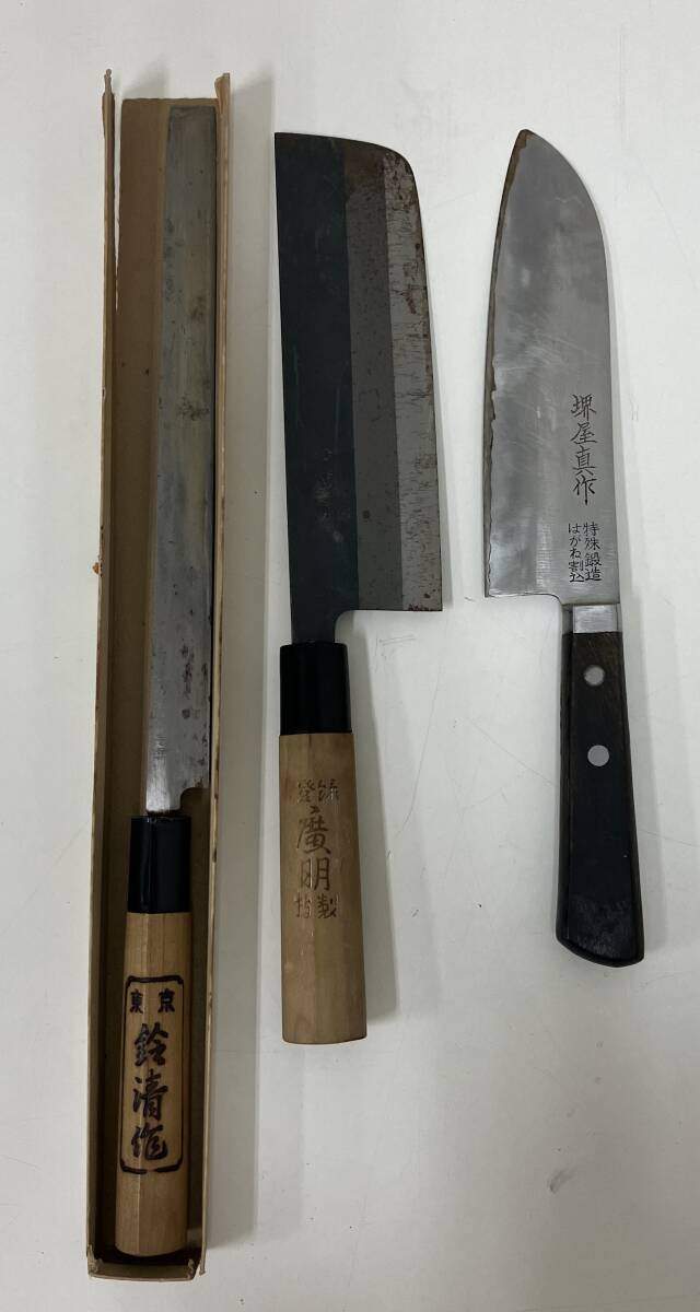 - 【包丁 三点セット】牛刀/堺屋真作/特殊鍛造/はがね割込み/寅明/東京鈴清作/料理道具/調理/刃物/Z611-027