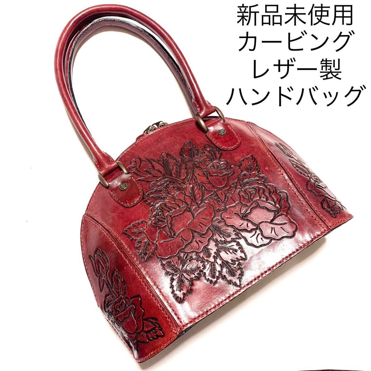 - 匿名配送 新品未使用 牛本革カービングレザーハーフムーンハンドバッグ ローズ 赤 トートバッグ ボストン型 バラ 薔薇