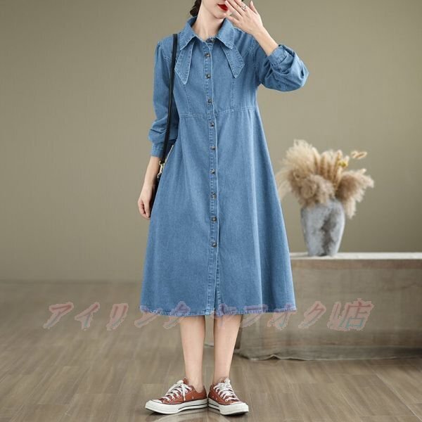 > ☆新品サイズ選択可 デニムワンピース ロング丈 デニムシャツワンピース 着やせ 女性 長袖 シャツワンピース ライトブルー