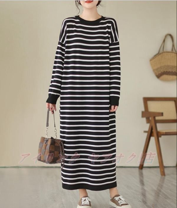 > ☆新品ニットワンピース 長袖 可愛い着痩せ ボーダー柄 マキシ丈 ロングワンピース 体型カバー カジュアルゆったり ブラック