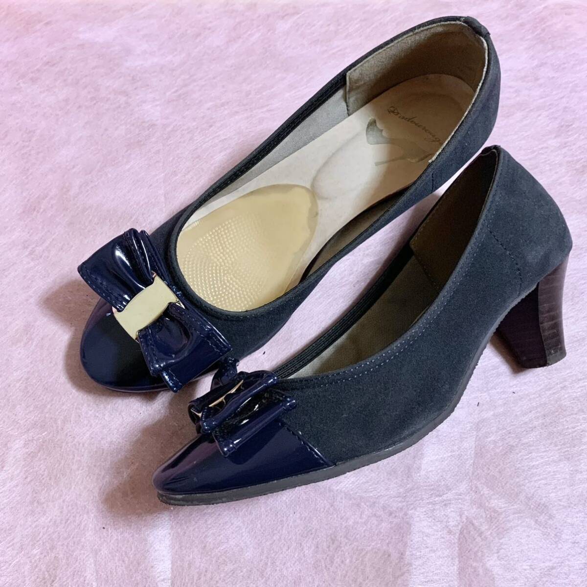 - 上品 エナメル×スエードリボンパンプス S 5cmヒール ネイビー 紺色 オフィスカジュアル アーモンドトゥ 起毛 ピーチスキン