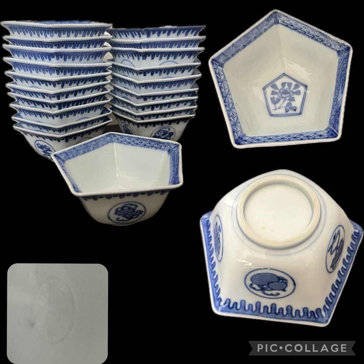 - 平安青峯 二十客揃い 五角小鉢 懐石料理 料亭 染付 五角形 小鉢 宝尽くし文様 吉祥