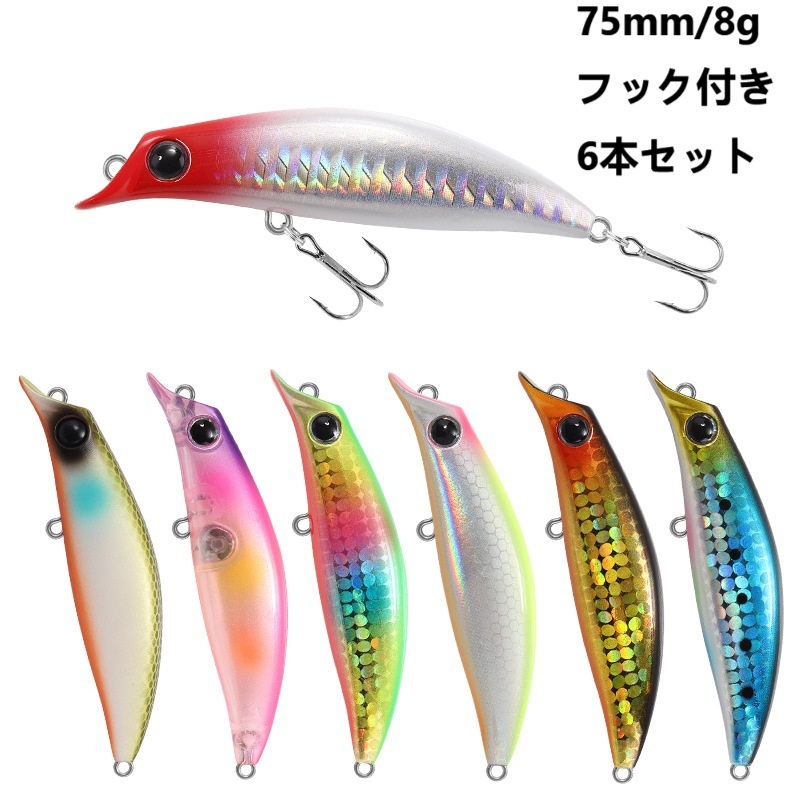 > フック付き 送料無料 6本セット シーバスミノー75s、シーバスルアー リップレスシンキングミノー
