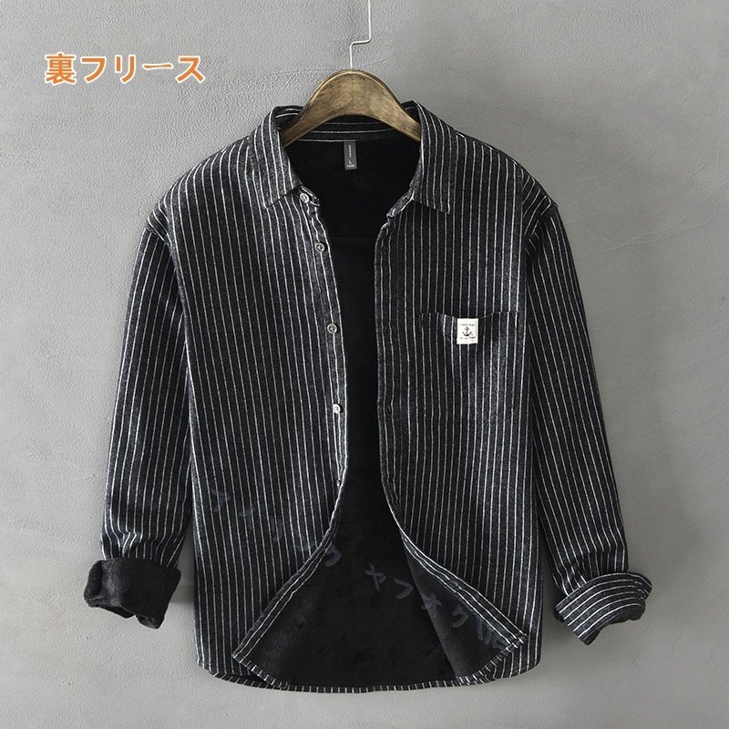 > ☆新品 裏フリース トップス シャツジャケット 長袖シャツ 裏ボア ストライプ メンズ ライトアウター ブルゾン クロ L