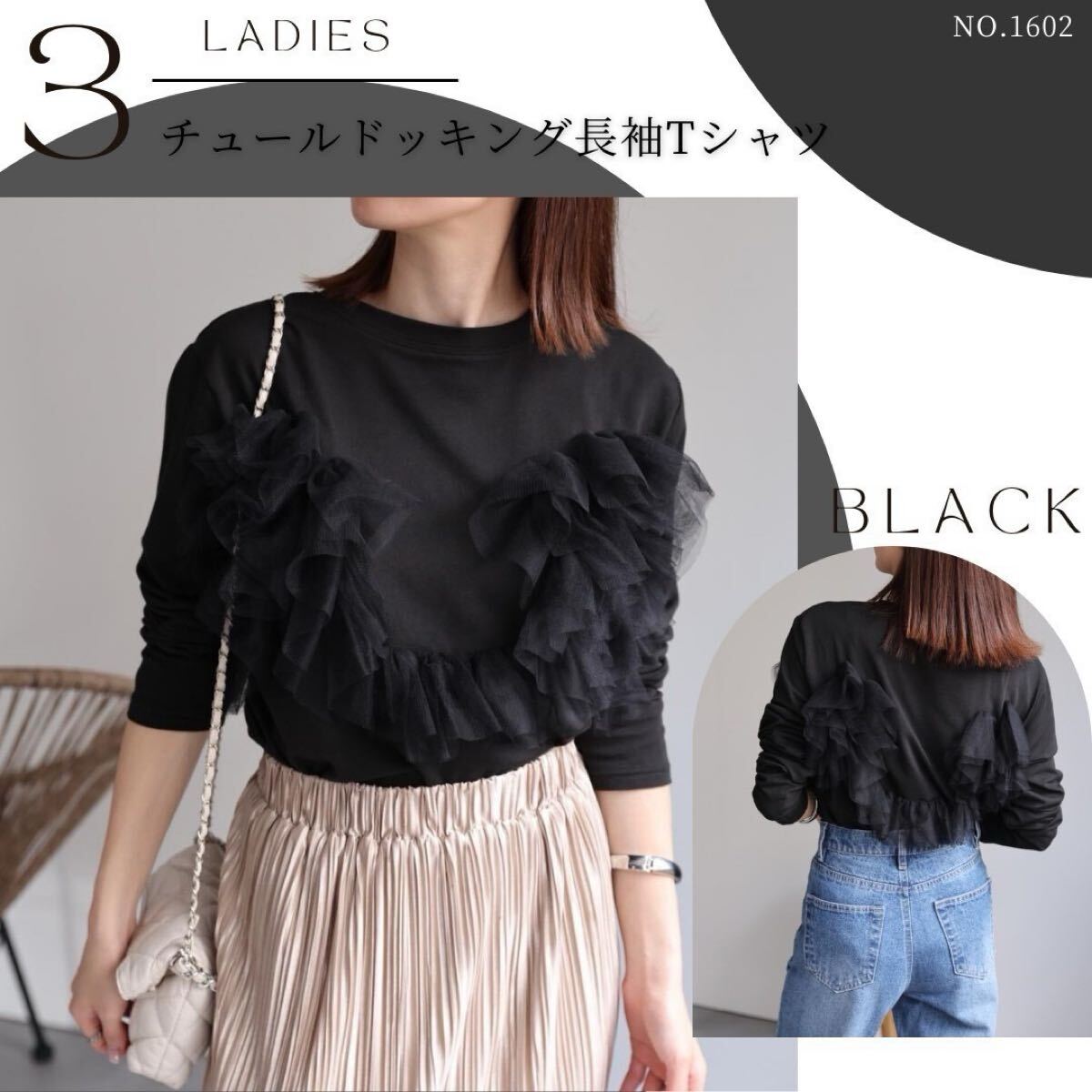 - チュール ドッキング 長袖 Tシャツ ブラック チュールフリル ロンT ギャザー