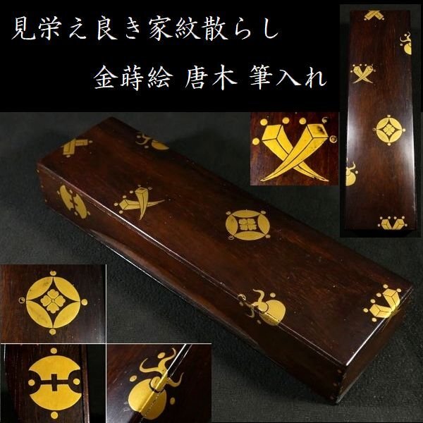 - 【 恵 #1402】 見栄え良き家紋散らし 金蒔絵 筆入れ 筆箱 唐木 検:漆芸/漆器/時代物/書道/書道具/蒔絵/螺鈿/水滴/