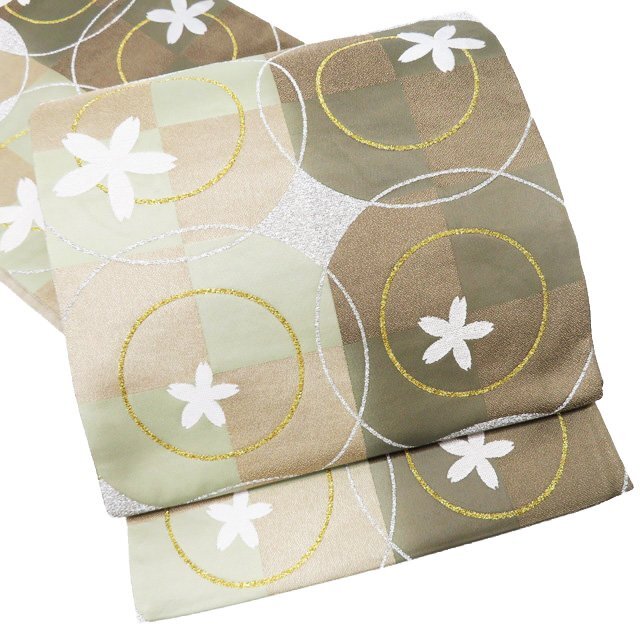 - 袋帯 中古 リサイクル 正絹 フォーマル 仕立て上がり 六通 市松創輪文 桜 灰みの黄緑系色 多色 金銀 きもの北條 A1111-14
