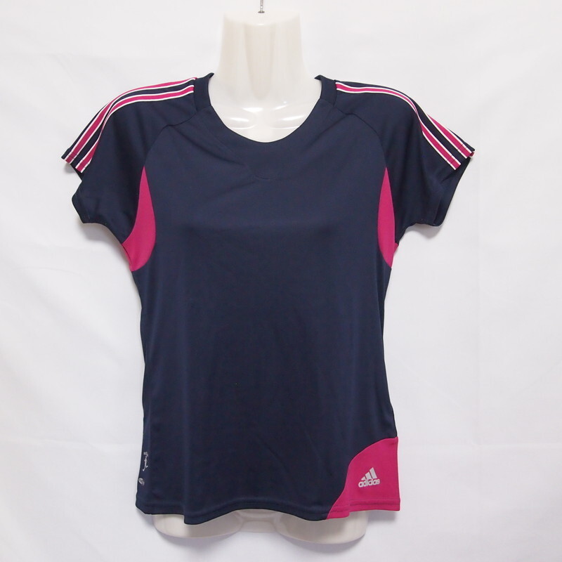 - 古着 レディースM adidas/アディダス ポリエステルTシャツ 半袖 スポーツ ジョギング ジム ヨガ トレーニング ネイビー 586594