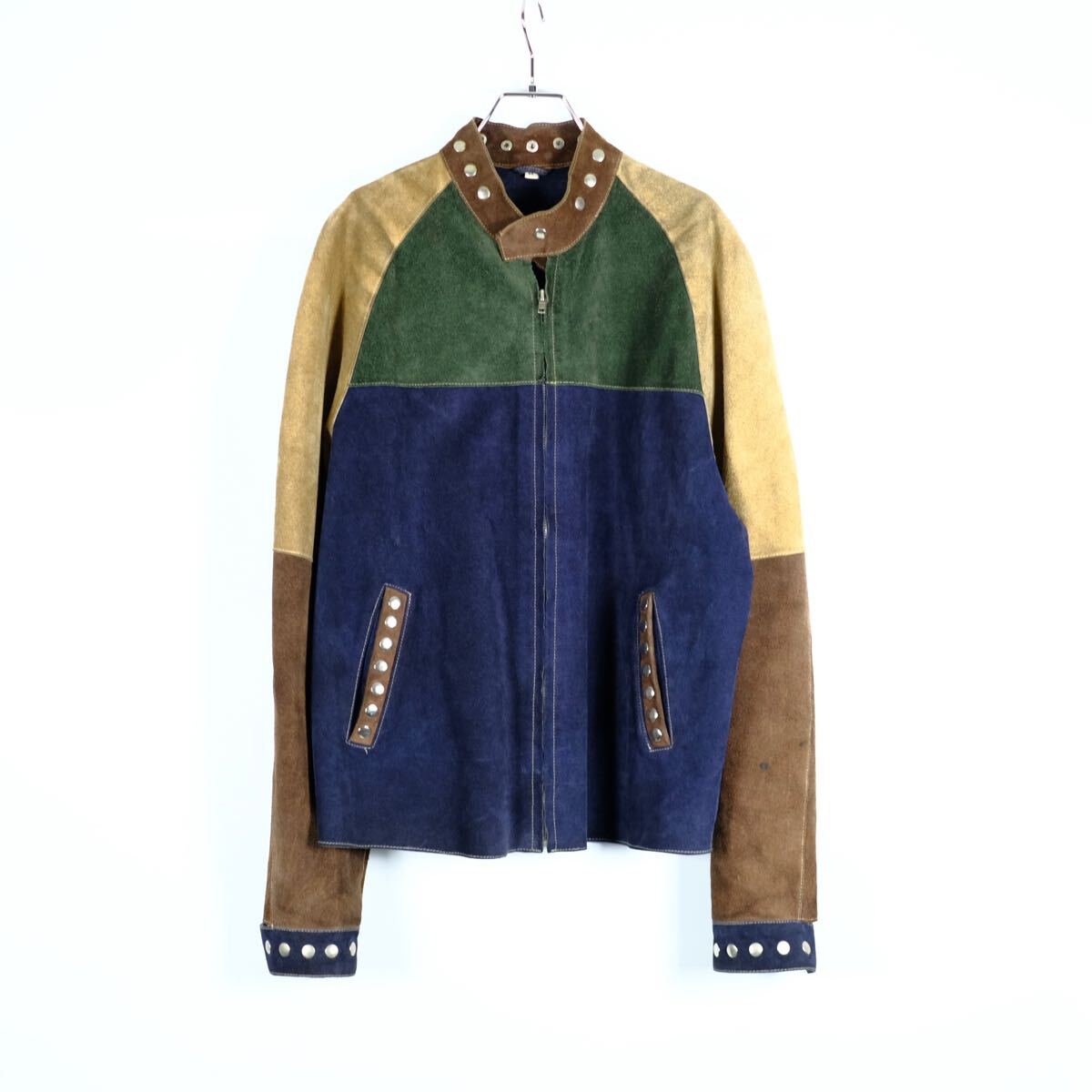 - 1980s ビンテージ レザーパッチワーク スタッズ ジャケット マオカラー 古着屋 海外仕入れ デザイン アート 本革