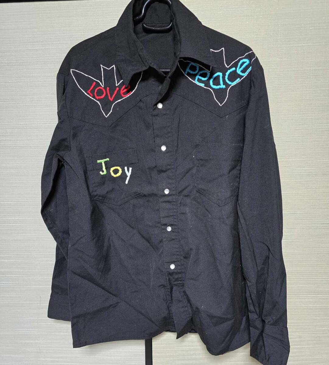 - 刺繍だらけラのラブ&ピース ブラック シャツヴィンテージ年代不明