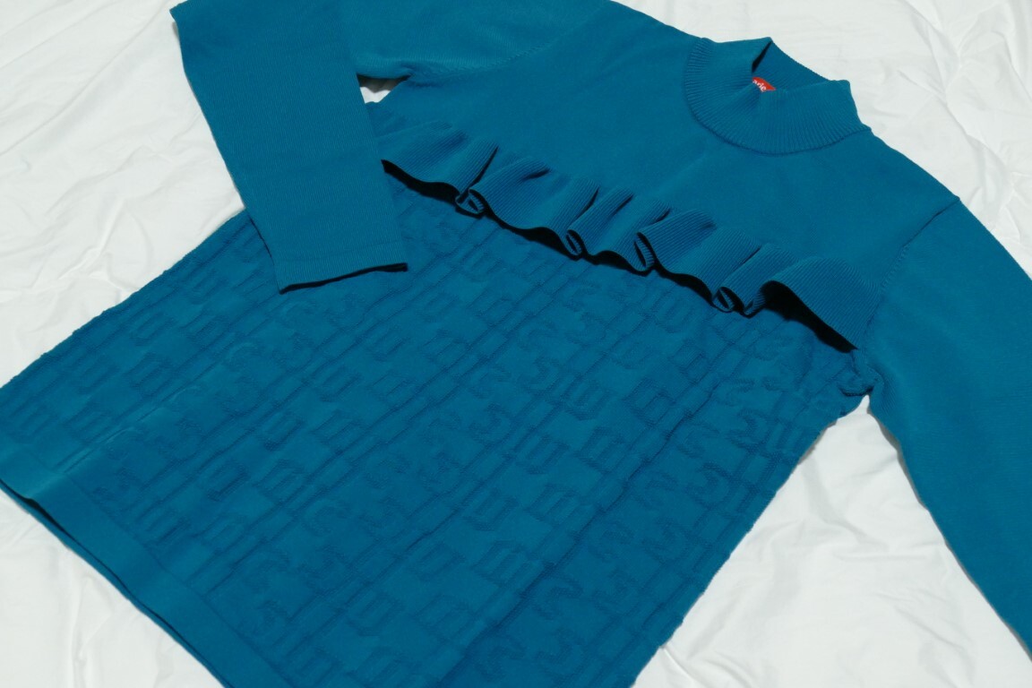 - B品★CMC23★秋ゴルフ★marie claire★マリ・クレールゴルフ★フリル切替デザインロゴジャカード長袖モックネックセーター★M/BL