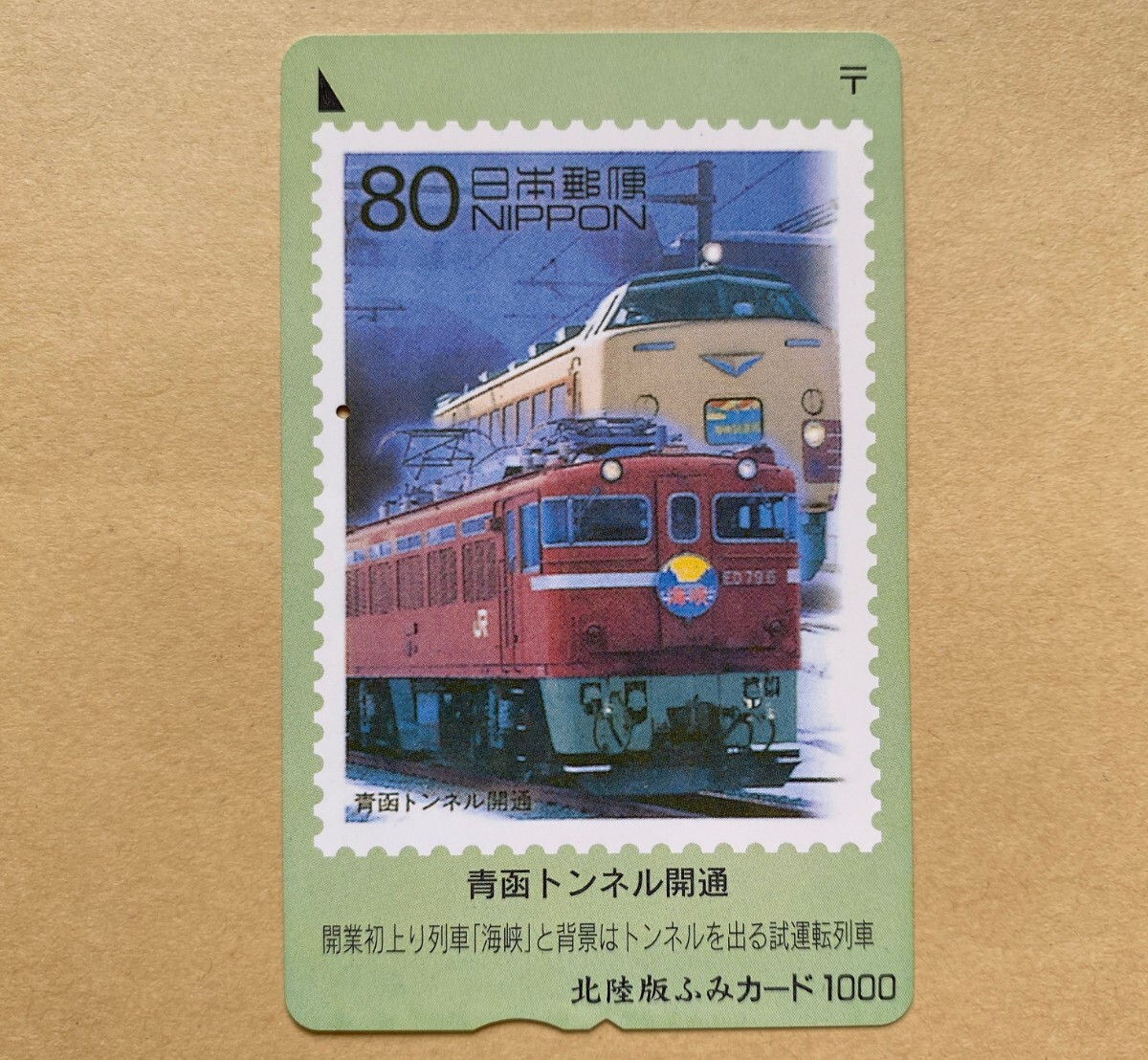 > 【使用済】 ふみカード 北陸版 青函トンネル開通 開業初上り列車「海峡」と背景はトンネルを出る試運転列車