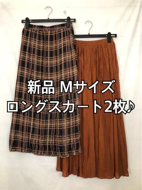 - 新品☆Mサイズ♪茶系&チェック♪ウエストゴムロングスカート2枚☆y216