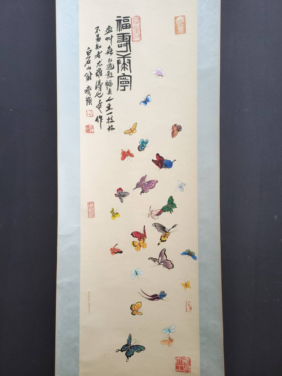 - 中国書画 典蔵掛け軸 【福寿康寧&斉白石】書道巻物 真筆逸品 古美術品 画心39.5 × 126.5cm 紙本 LOT-1191