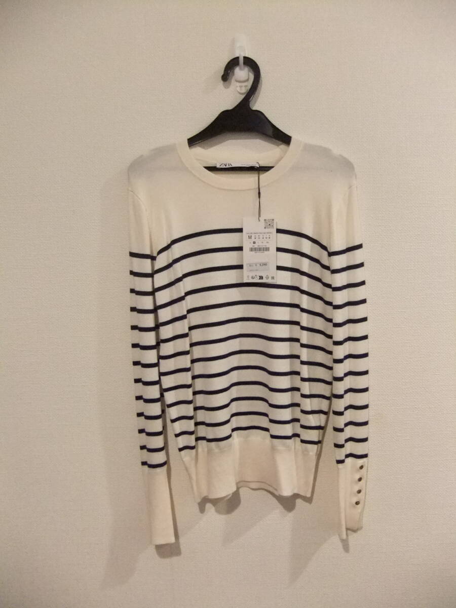 - 新品、タグ付き!ZARAのネイビー×キナリのボーダートップス、Mサイズ!