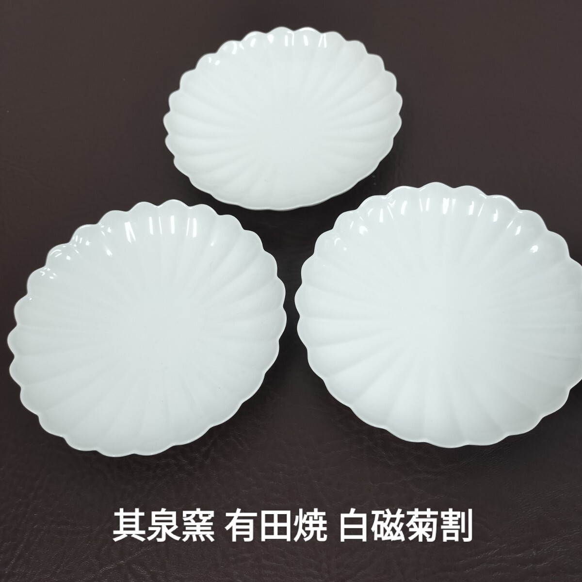 - 【USED】其泉窯 有田焼 白磁菊割 銘々皿 小皿 3枚セット/ 菊花皿 白菊 白磁 直径14.5
