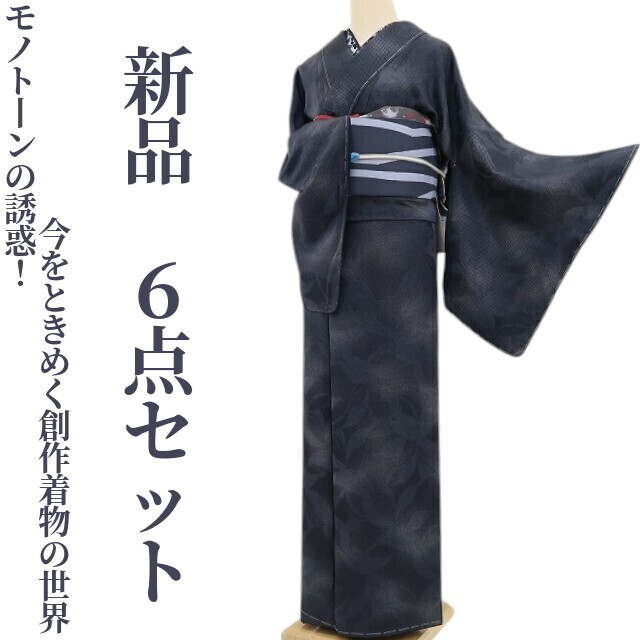 - tomihisa 新品 6点セット 着物“モノトーンの誘惑!今をときめく創作着物の世界”仕付け糸付 小紋・袋帯・帯揚げ・半衿4727