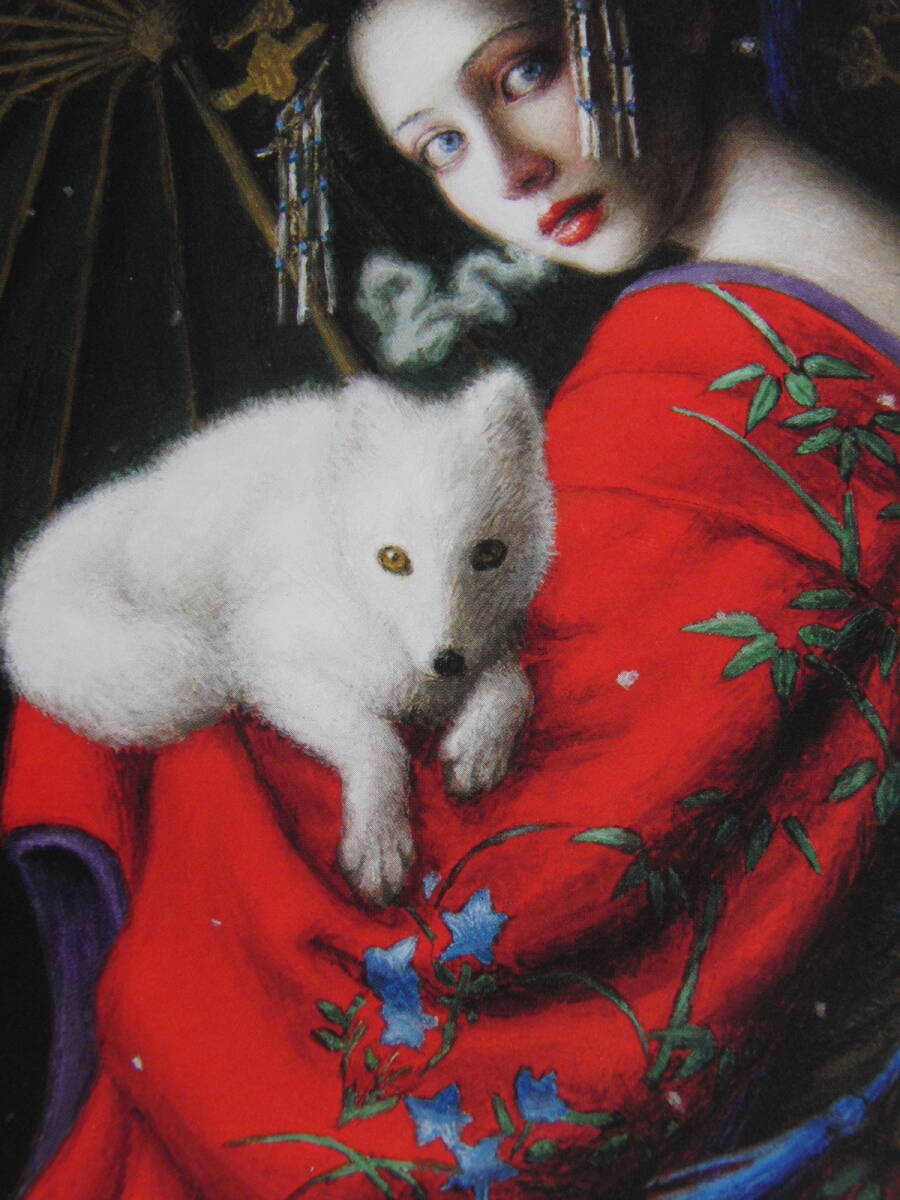 - 吉井千恵、【白狐】、希少な額装用画集より、厳選、新品額装、マット額装付、状態良好、美人、日本人画家