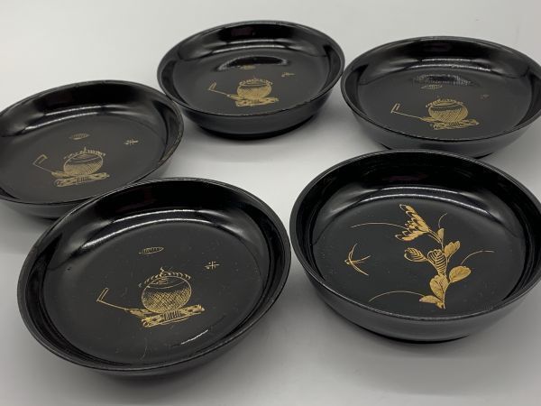 - 【漆器】骨董 時代物 『天然木漆塗り 金彩図柄 酒盃』図柄違い K1217C