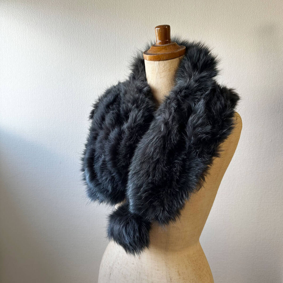 - N2185a 美品 ラビット ファー スヌード 襟巻 ショール ポンポン付 グレーブラック 毛皮 ウサギ