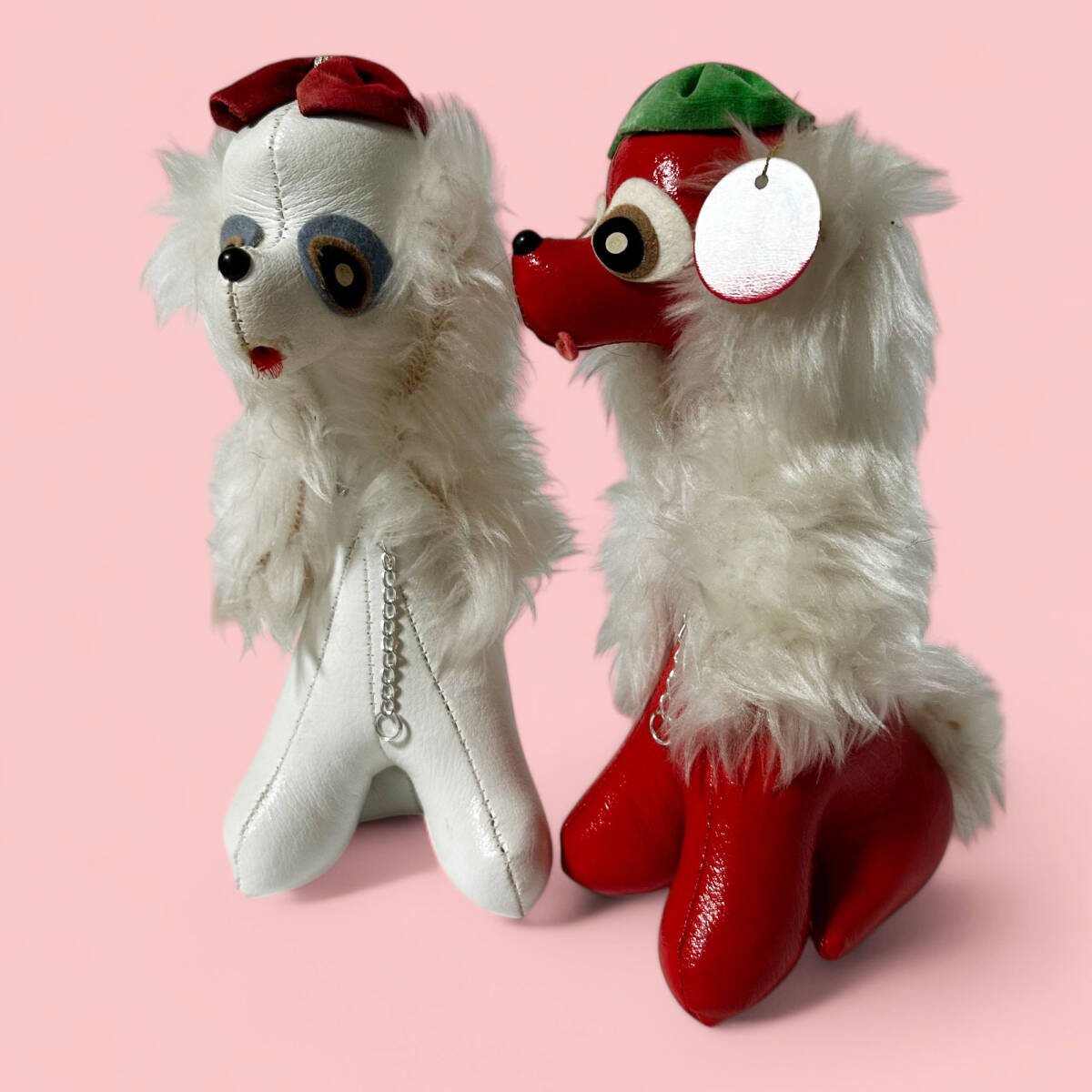 > K2411-18 昭和レトロ タグ付 レザー動物 犬 2頭 セット 白/赤 ファンシー雑貨 ぬいぐるみ 当時物