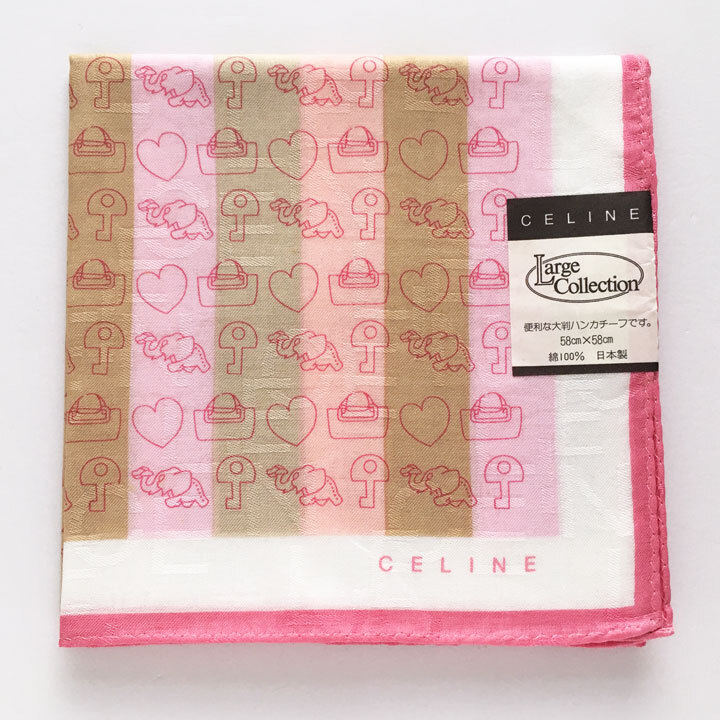 > セリーヌ / CELINE ハンカチ アイテム(象・ハート・鍵・カバン)柄 ピンク・ベージュストライプ生地 ロゴ文字透かし入り【6294】