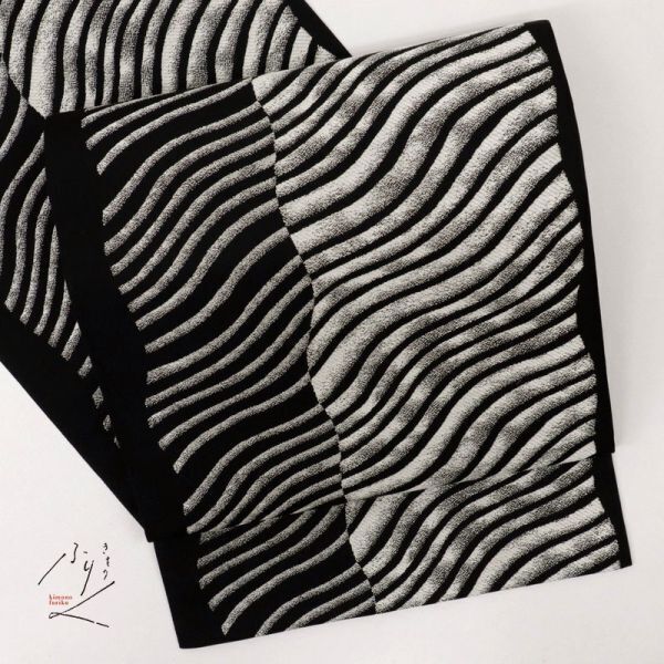 - 【袋帯】 本袋帯 交差するゆるやか縞模様 黒地 落款有 正絹 着物 FB1-14