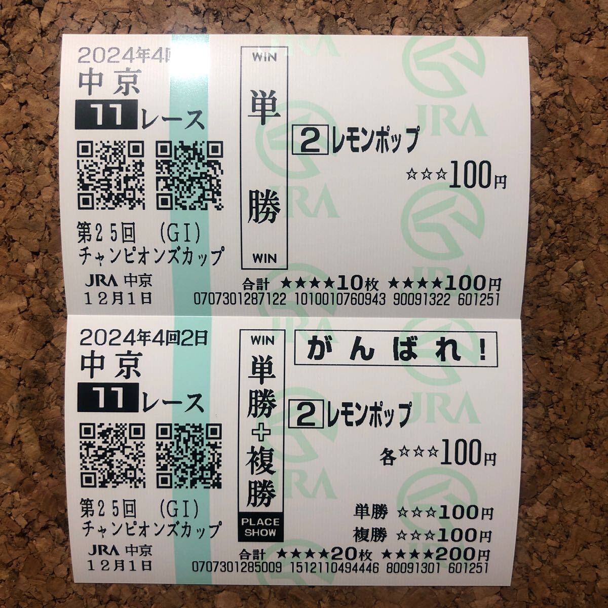 - 単勝 応援馬券 レモンポップ 現地購入的中馬券 チャンピオンズカップ 2024年12月1日 中京競馬場 JRA ラストラン 引退レース 坂井瑠星