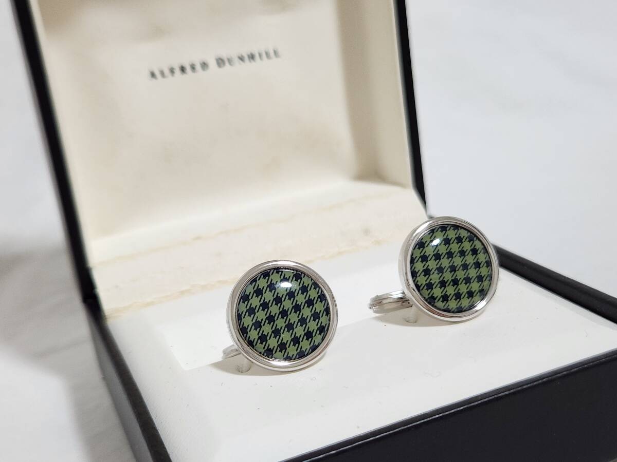 - 正規 Alfred Dunhillアルフレッドダンヒル チェックパターン ラウンドコンビカフス サークルカフリンクス 緑系×銀 ラージLボタン 付属有