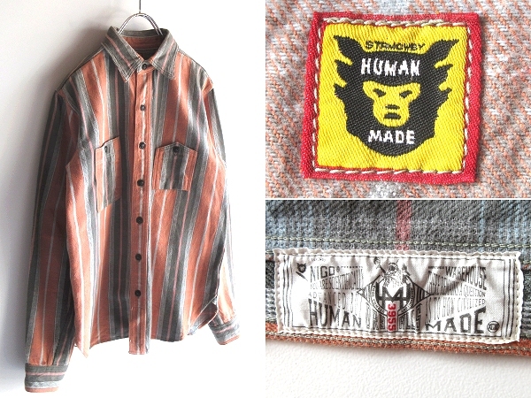 > HUMAN MADE ヒューマンメイド ビンテージ型 ガチャポケ 山ポケ マチ付 ストライプパターン チェック柄 フランネル ヘビーネルシャツ S NIGO