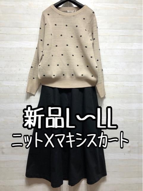 - 新品☆L~LL♪ドット柄ニット&綿100%マキシ丈スカート〇A850