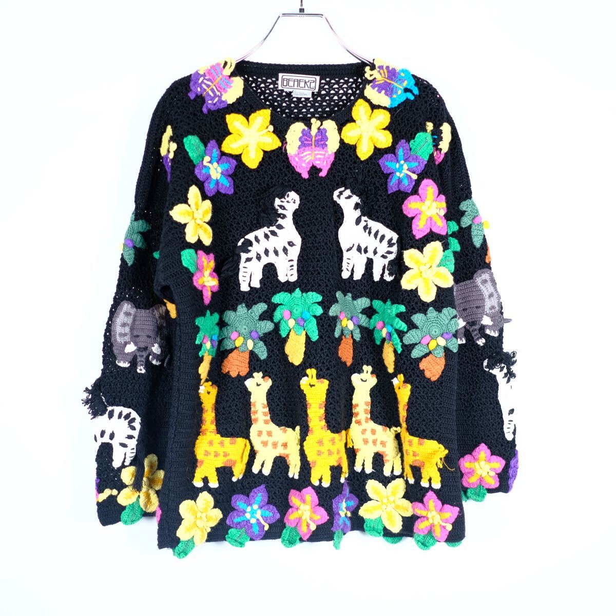 > 1980s ビンテージ ハンドメイドニットセーター 刺繍 立体 動物 古着屋 ヴィンテージ 総柄 アート 芸術 長袖 コットン