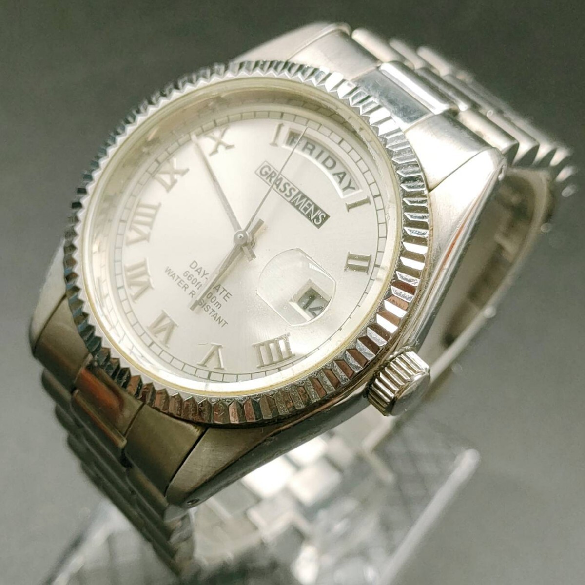 > T184 【動作品】 GRASS MENS グラスメンズ GM-9031 腕時計 クウォーツ 3針 シルバー文字盤 デイデイト アナログ ヴィンテージ アクセ
