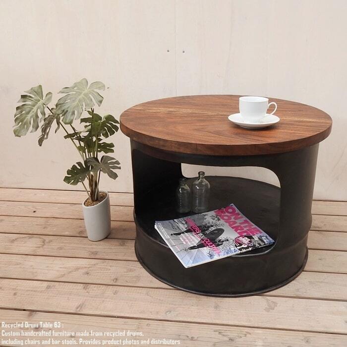 > ドラム缶をリメイクしたテーブル 63cm 黒 ラウンド 天然木 センターテーブル ローテーブル リメイク家具 工業系 アイアン家具