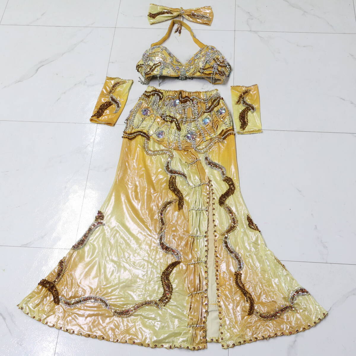 > 『送料無料』【ベリーダンス用 オリエンタル衣装】イエロー ラインストーン ビーズ 花 蝶 星 豪華 黄色 ゴールド 光沢 左前スリット入り