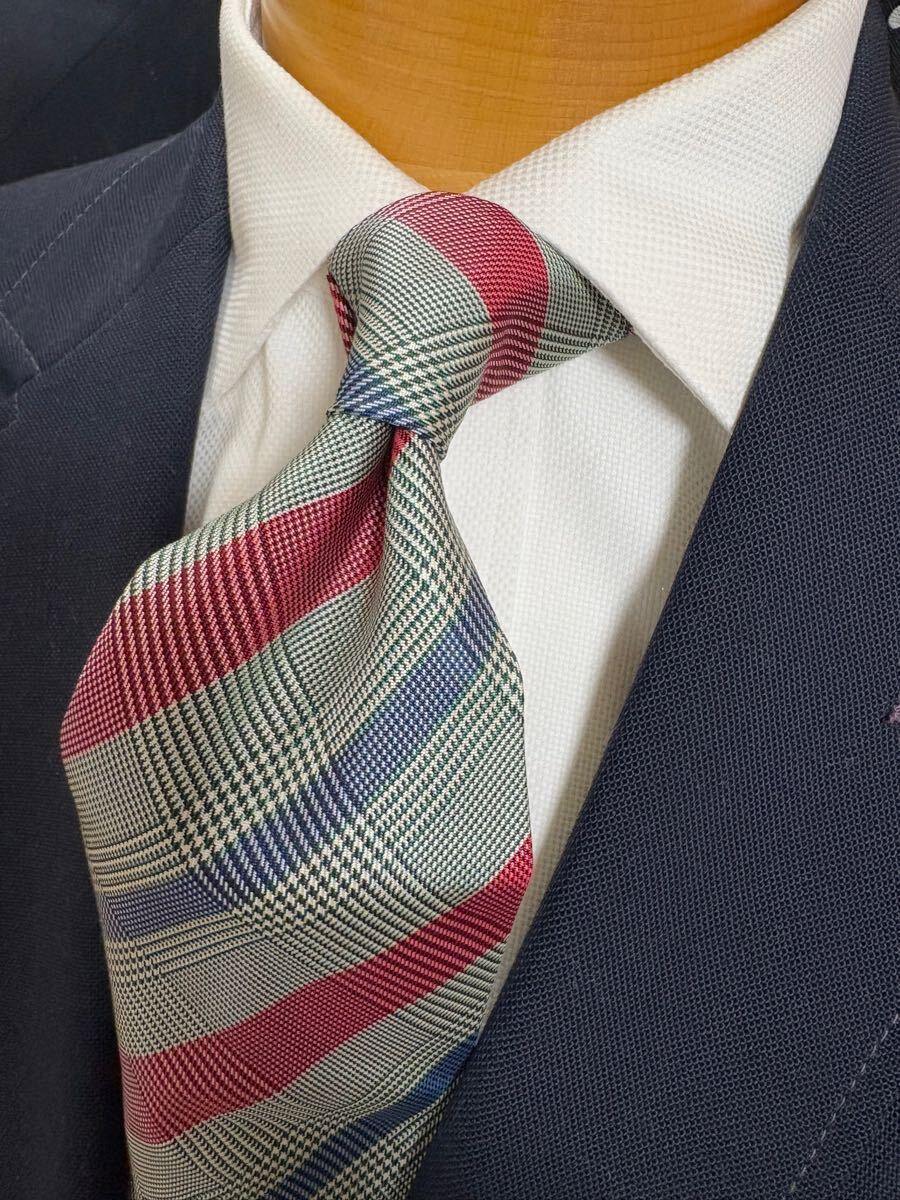 - 【美品】ダンヒル イングランド製ネクタイ 大剣約9.5cm タータンチェック柄ストライプ 高級シルク レッド×ライトグレー