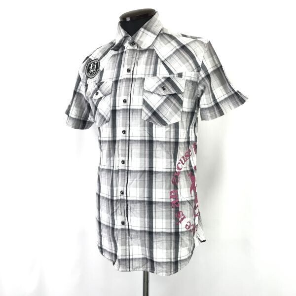> 美品★BADBOY/バッドボーイ★シワ加工/半袖ウエスタンシャツ【メンズL/gray/グレー/チェック柄】スナップボタン/Tops/Shirts◆BH839