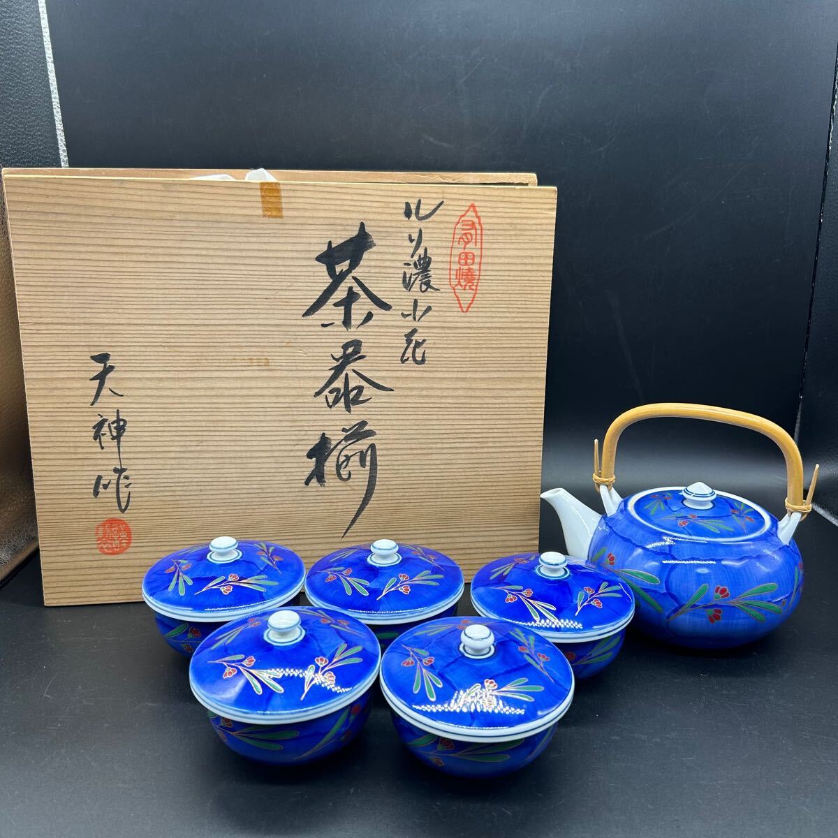 - 有田焼 天神作 ルリ濃小花 急須 湯呑み 茶器揃 茶器セット 和食器 タ16