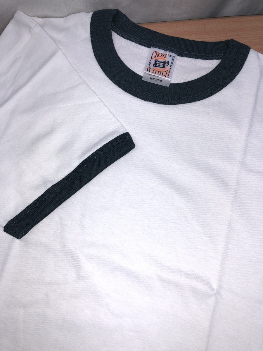 > 半袖Tシャツ リンガーTシャツ ヘビーウエイト天竺 Mサイズ 白Xブルーグレィ CROSS&STITCH★未使用格安!