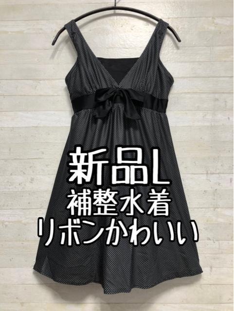 - 新品☆L♪黒系ドット柄♪リボンかわいい補整ワンピ水着〇B714