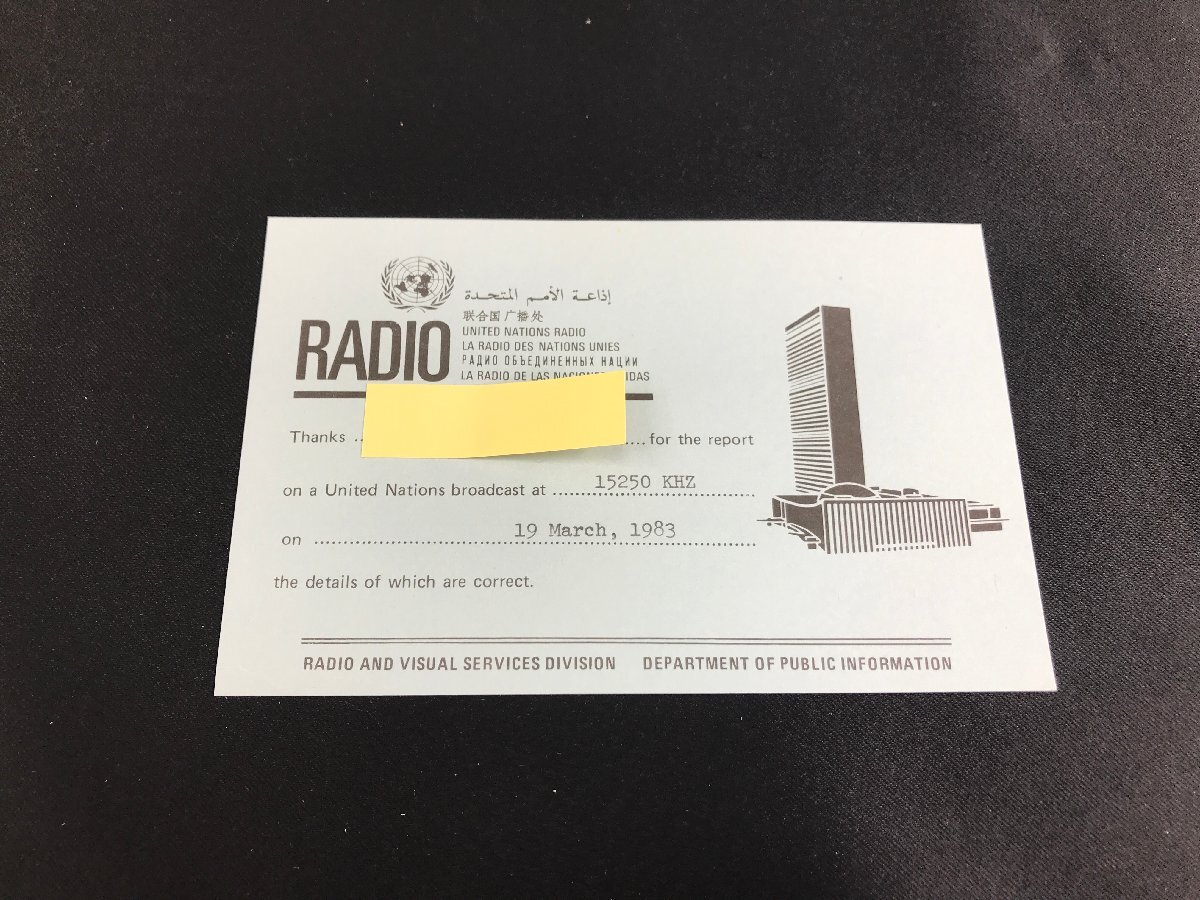 - 希少 ベリカード UNITED NATIONS RADIO 国際連合放送 1980年代 受信報告証明書 QSL S12-56