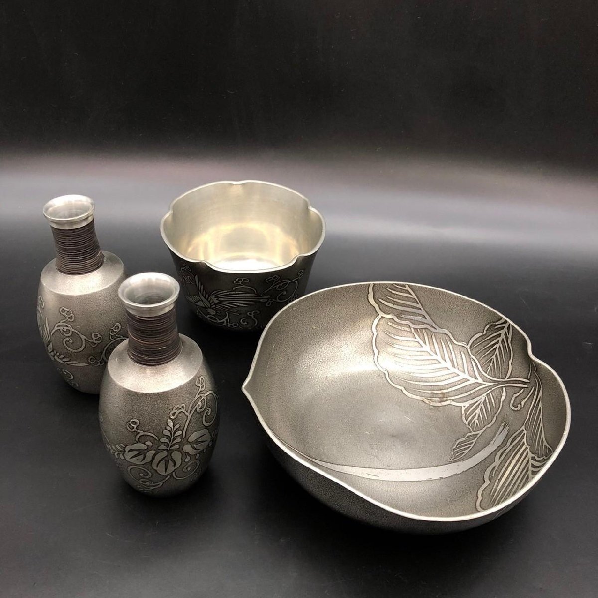 - SW1204-11-4 継山造 まとめ 錫製 菓子器 茶道具 煎茶道具 金属工芸 茶事 古錫 徳利 酒器 鉢 最大19×19×6㎝ 80サイズ