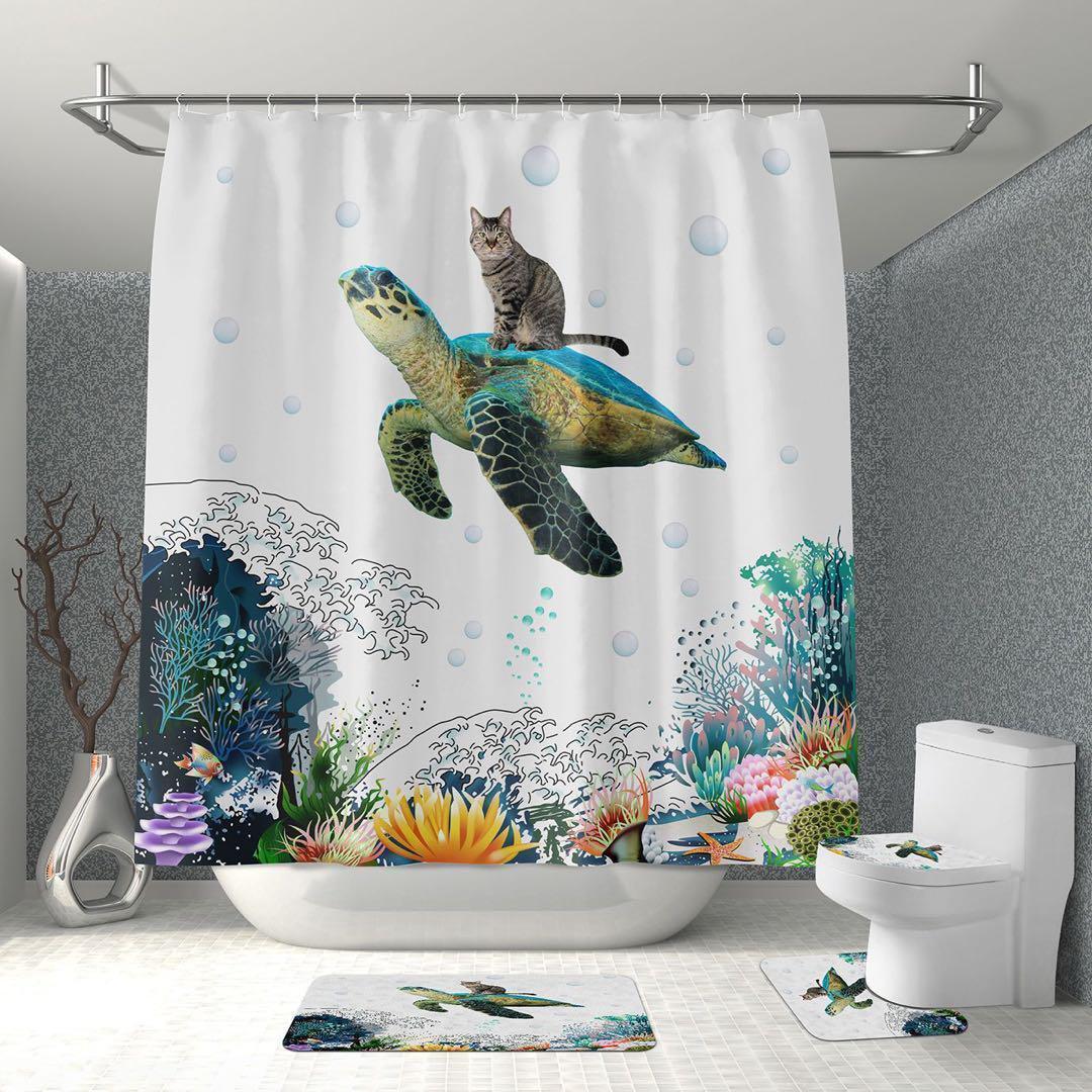 - ロングタイプ シャワーカーテン 猫と亀 亀の背に乗って 送料無料 新品