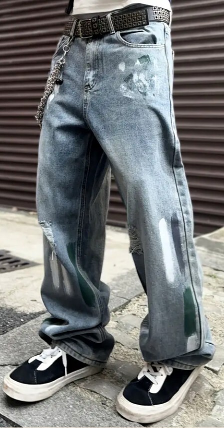 > ◎新品未使用◎ゆるダボ◎ビッグサイズ◎クラッシュペイント加工ワイドレッグジーンズ Size XL ヒップホップストリート系 オールシーズン