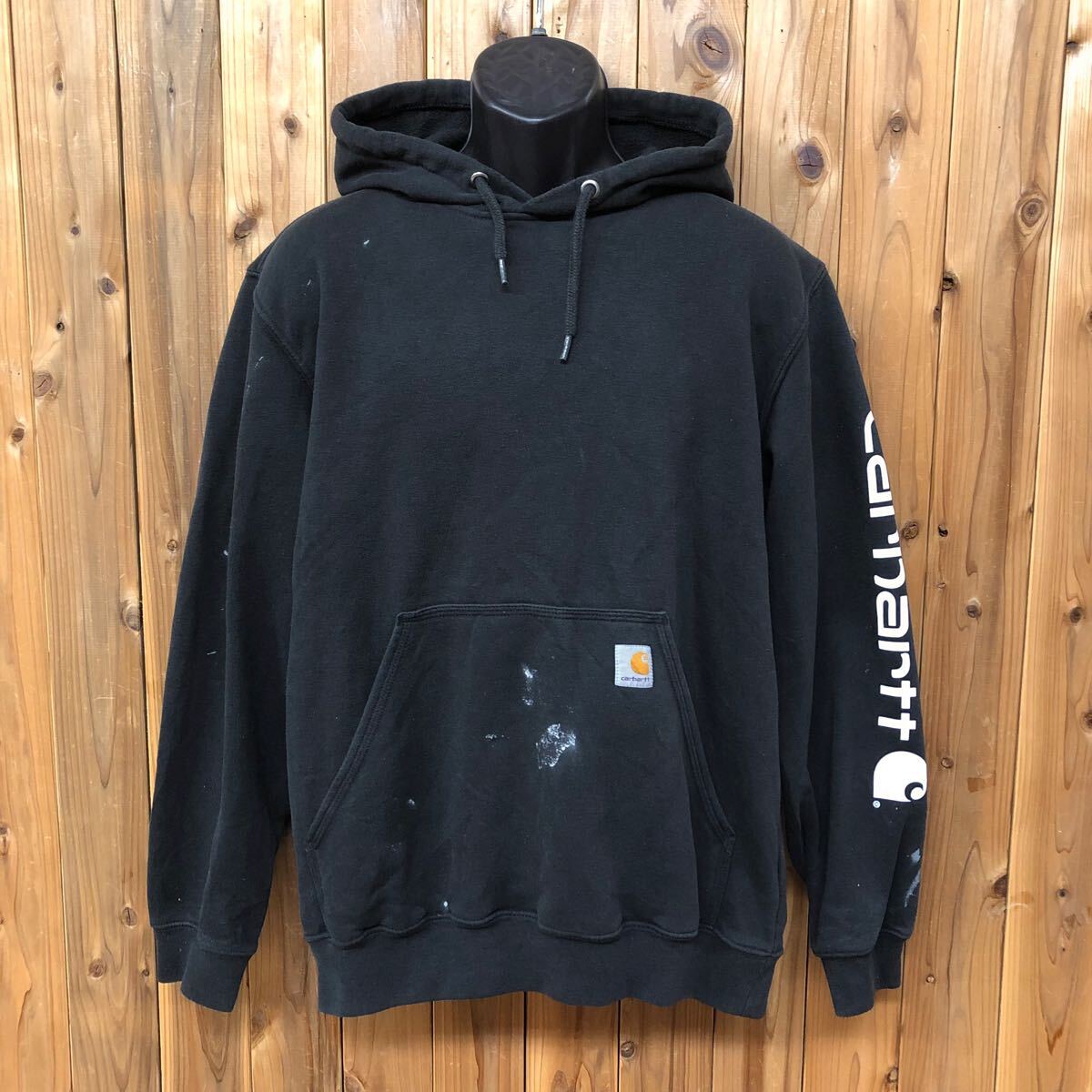 > Carhartt*ORIGINAL FIT /カーハート メンズM 長袖 スウェット プルオーバー パーカー 裏起毛 ビッグロゴ 黒 ワーク アメカジ USA古着