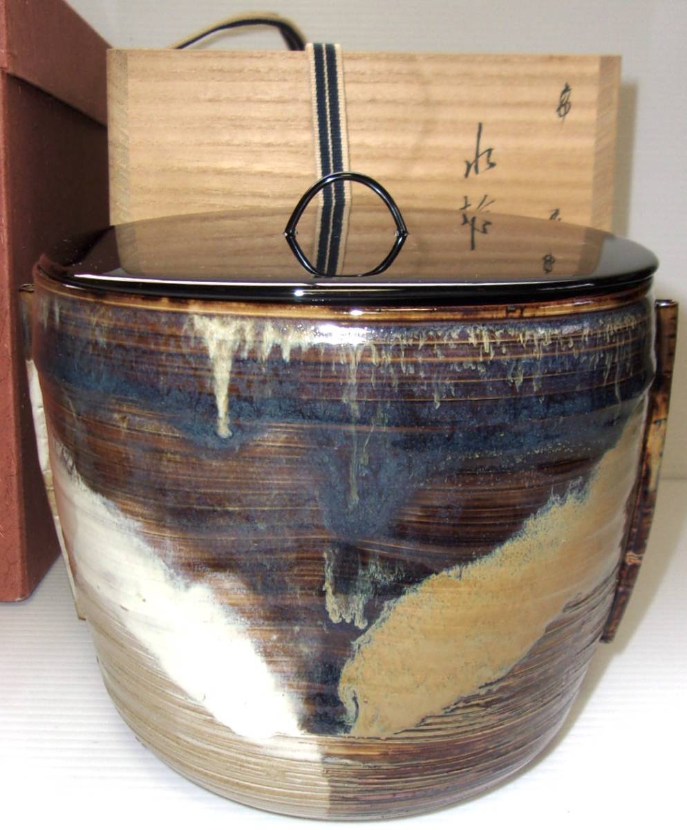 > 福岡県 高取焼 亀井楽山作 水指 管耳付 味楽窯 (木箱 外箱有り 茶道具)1995年頃の購入品
