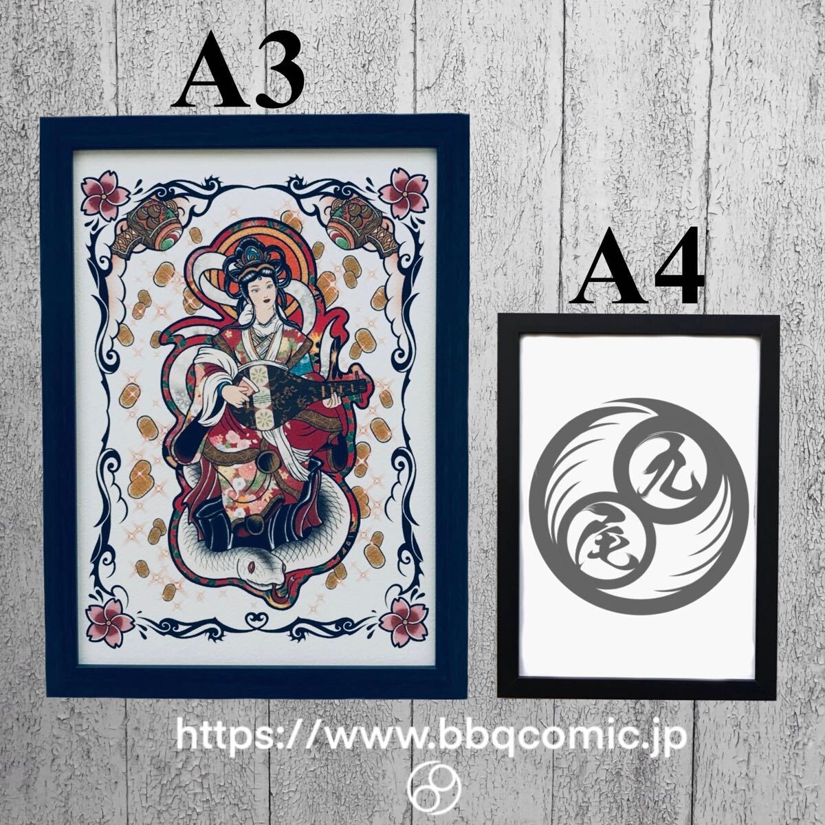 - 開運 招福 縁起物 尾九 オリジナル イラスト 打ち出の小槌 大判小判 七福神 弁財天 白蛇 A3サイズ 黒色 フレーム付き 壁掛け インテリア